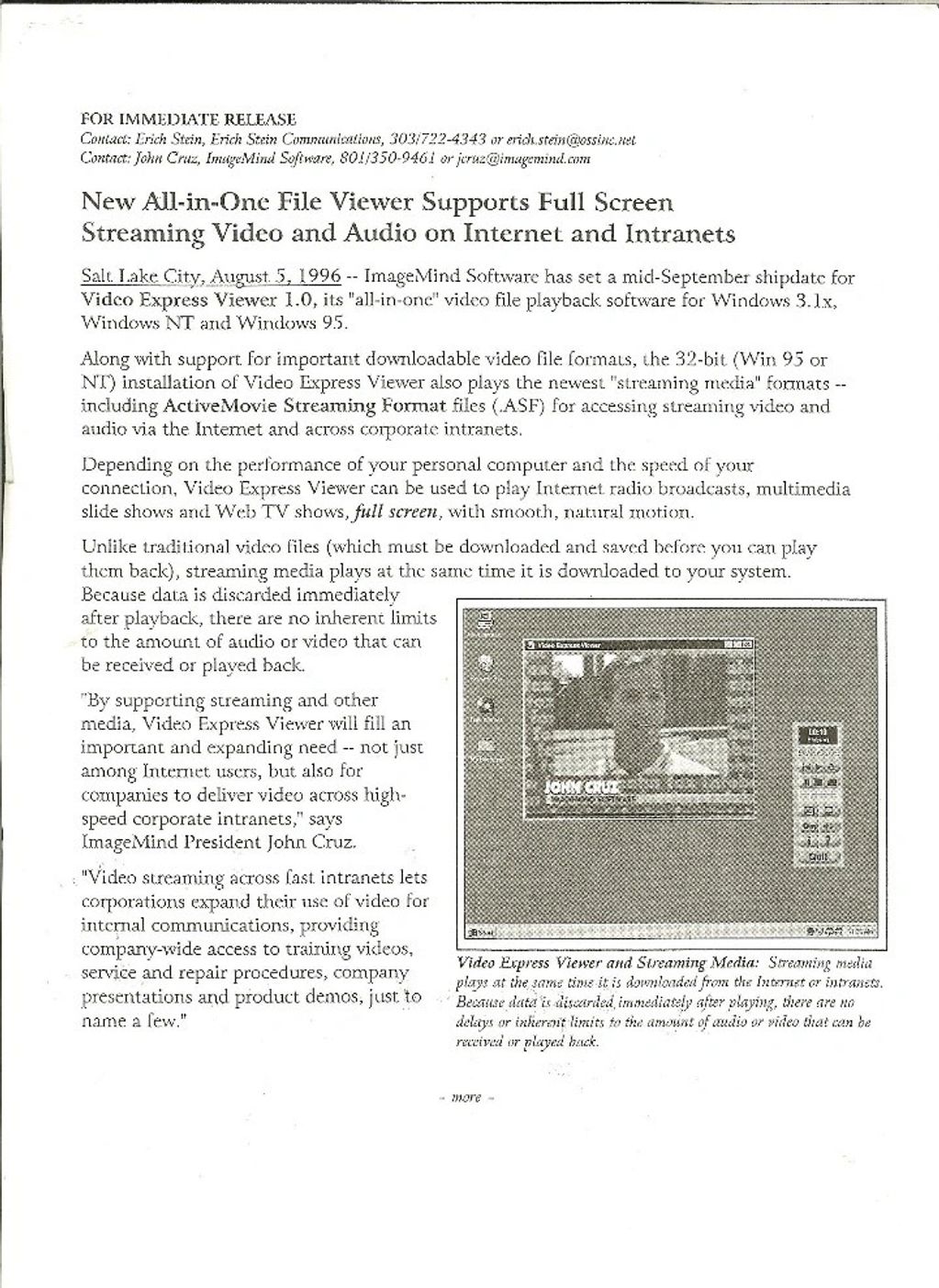 Dec 1996. Microsoft Interactive Developer did a story on ImageMind Video Express Viewer.