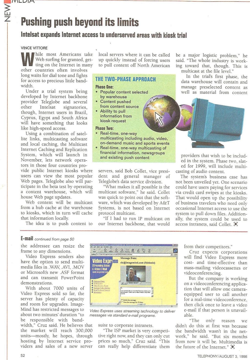 August 3, 1998, New Media Magazine 2nd page of how ImageMind's Video Express Email is pushing beyond the limits of the Internet and streaming technology.